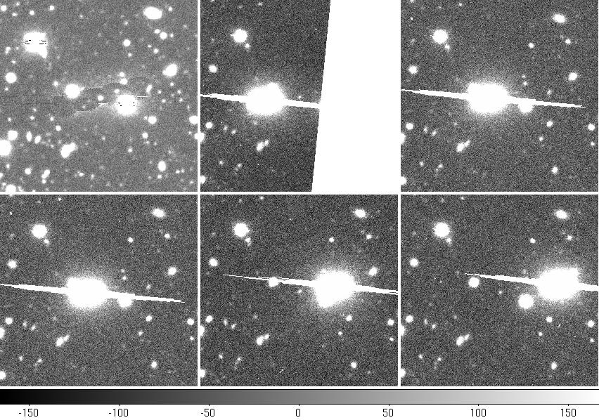 A very bright asteroid (677 Aaltje). The field size here is just over 1' and the five similar postage stamps show the asteroid moving ~32"/hour over the course of 90 minutes or so. The first postage stamp shows how the saturated pixels were automatically removed from the stack, but the nearby scattered light was not very well removed.