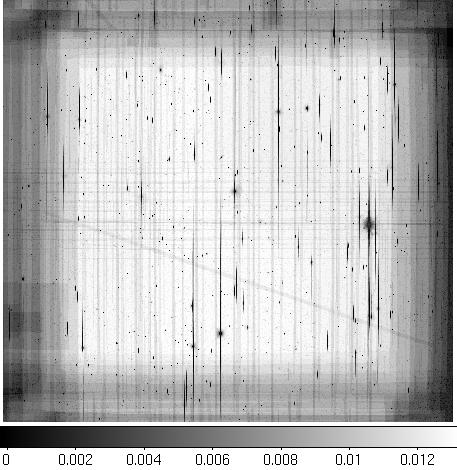 Depth and masking: the depth is variable. If your science depends on having a uniform selection function, please take note of the THRESHOLDR field in the Sextractor table, which indicates the detection threshold (in ADU) at the position of each object. If you are working with images rather than catalogs, use the weight image (explained in the image access page) to determine relative depths. The weight image for a typical 40'x40' subfield looks like this: